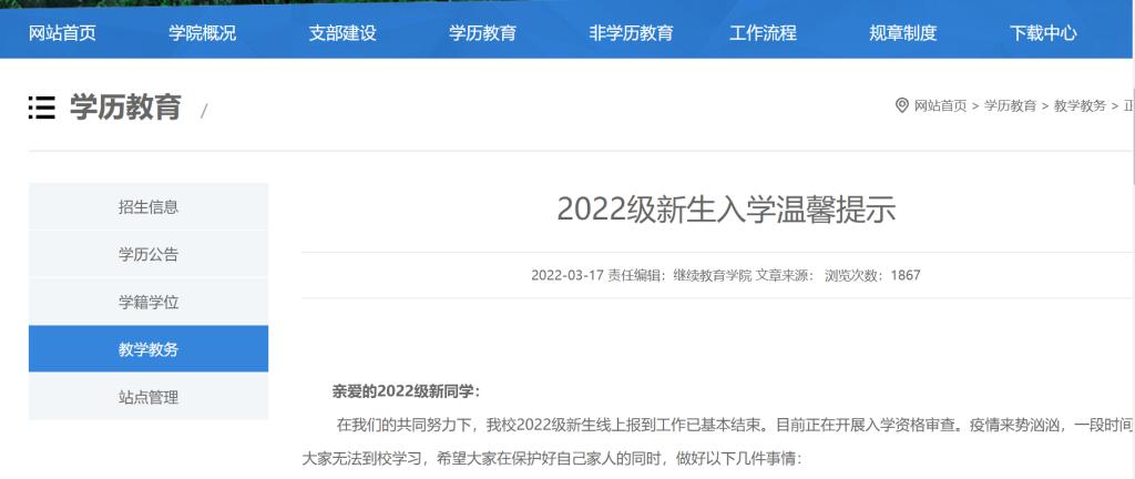 为做好疫情下的继续教育新生入学工作,冠军白菜策略网会同各办学单位提前谋划、精心组织,采用了新的教学管理和服务模式,有序开展新生线上报到、注册和入学教育工作。